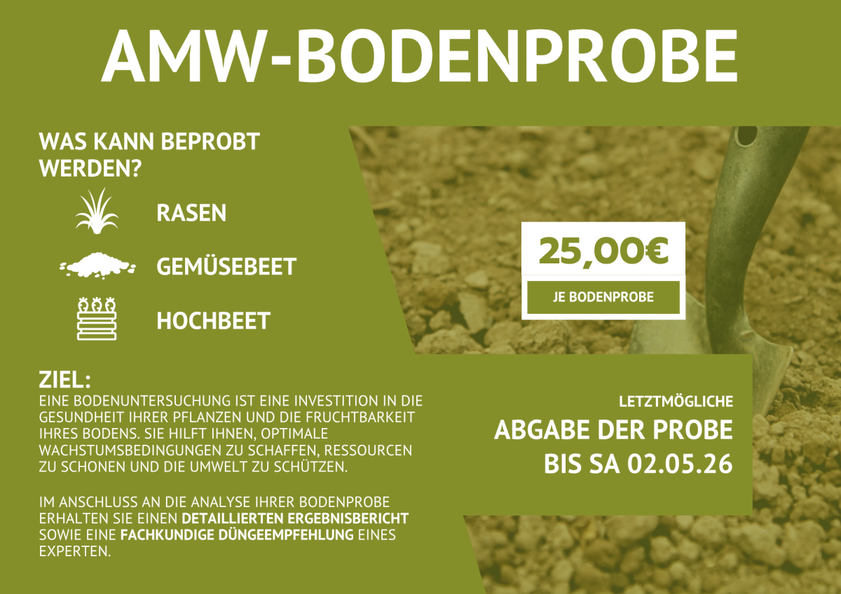 Bringen Sie die Bodenprobe samt ausgefülltem Etikett bis spätestens SA 02.05.26 in den AMW
